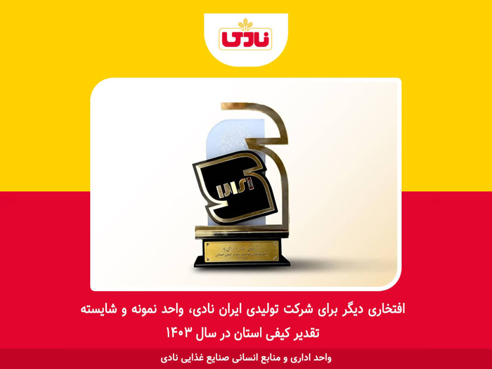 در مراسمی که بمناسبت روز جهانی استاندارد در تاریخ 1404/07/26 با حضور جناب آقای دکتر هادی حق شناس، استاندار محترم گیلان و جناب آقای دکتر اللهیار مصباحی، معاونت محترم هماهنگی امور اقتصادی و توسعه منطقه ای استانداری گیلان و جناب آقای دکتر حمید اشتری، معاونت محترم توسعه و حقوقی و مجلس سازمان استاندارد کشور و جناب آقای دکتر مهدی محمدی، مدیر کل محترم استاندارد گیلان و جناب آقای دکتر کوچکی نژاد، نماینده محترم مردم شهرستان رشت در مجلس شورای اسلامی و جمع کثیری از مدیران محترم دولتی و بخش خصوصی و اصحاب رسانه در سالن همایشهای الغدیر استانداری گیلان برگزار گردید، شرکت تولیدی ایران نادی به پاس رعایت الزامات قانونی استاندارد به عنوان واحد نمونه و واحد تولیدی شایسته تقدیر کیفی استانی سال 1403 اعلام و معرفی گردید و طی آن تندیس و لوح تقدیر به جناب آقای مهندس اصغر طلوع بهبود به نمایندگی از طرف شرکت ایران نادی اهداء گردید.